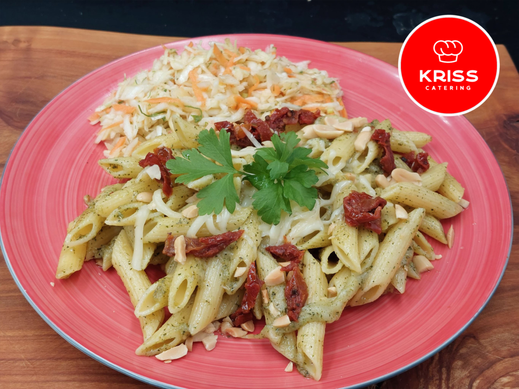 Makaron penne z pesto bazyliowym oprószone tartym serem