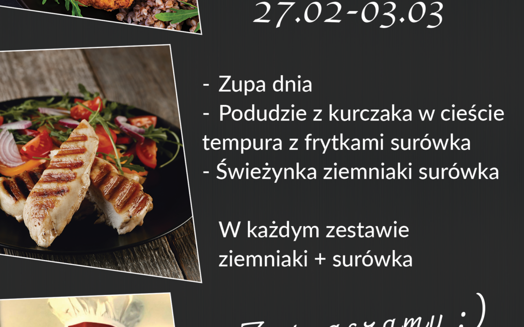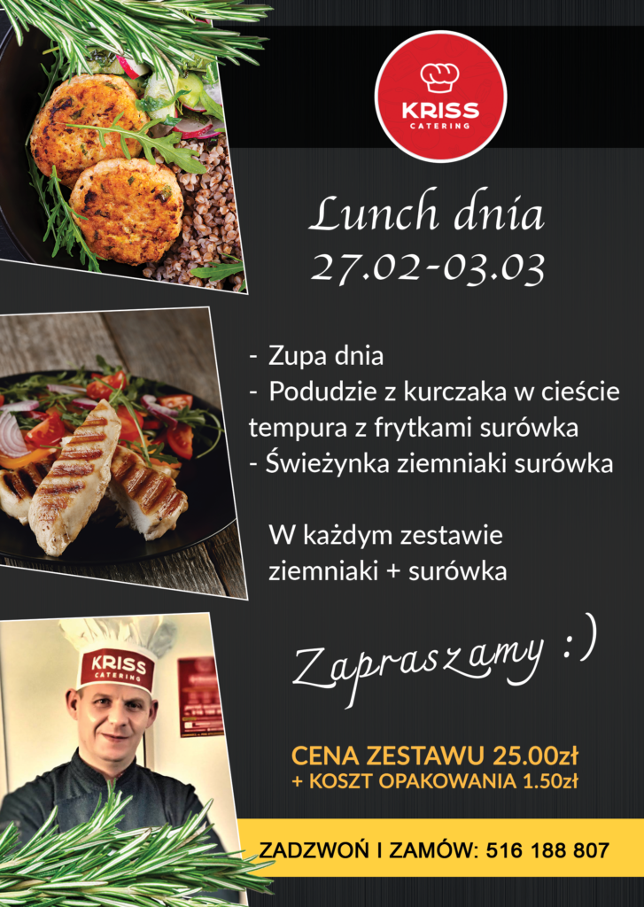 Lunch Dnia 27.02-03.03 utworzone przez Kriss Catering | lut 27, 2023 | Aktualności | 0 komentarzy Rozpoczynamy nowy tydzień a Kriss Catering przygotował dla Was propozycję na Lunch dnia Cena zestawu zupa + danie dnia w cenie 25zł ________________________ 516-188-807 Ważne informacje Odbiór zamówień w naszym lokalu w Choroszczy na ul. Powstania Styczniowego 14A płatność gotówką oraz kartą Pełne menu https://krisscatering.pl/ Prześlij komentarz Anuluj pisanie odpowiedziTwój adres e-mail nie zostanie opublikowany. Wymagane pola są oznaczone *Komentarz * Nazwa * E-mail * Witryna internetowa Zapisz moje dane, adres e-mail i witrynę w przeglądarce aby wypełnić dane podczas pisania kolejnych komentarzy.